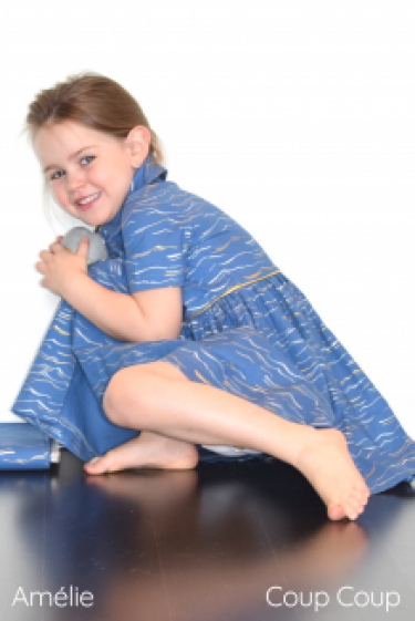 Een mooi designerkatoentje, blauw met zilver en gouden golven